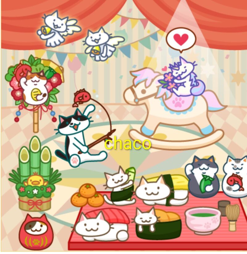 干支のネコちゃんはホジョ券が500枚必要で、コネコ、オトナネコ、デブネコがいます。去年はコネコのみとの交換しかできなかったのですが、今年はみんなお迎えできました。午コネコちゃんがユニコーンみたいで可愛くてお気に入りです。
